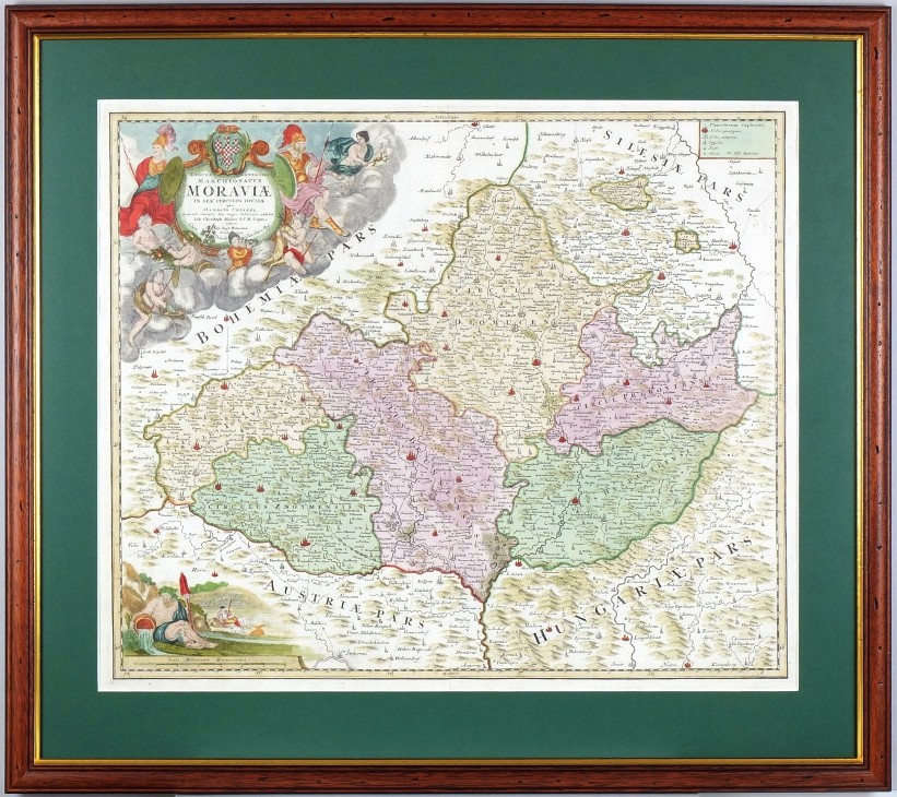 Morava."Tabula Generalis Marchionatus Moraviae in sex circulos divisae". Původní kolorovaná mědirytina podle J. Ch. Müllerovy mapy Moravy. Vyd. J. B. Homann v Norimberku, ca. 1720. S velkou figurální kartuší s erbem, další fig. kartuší s měřítkem mapy ("Scala Milliarium Moravicorum") a kartuší s vysvětlivkami ("Characterum explicatio"). 48,5:58,5 cm.