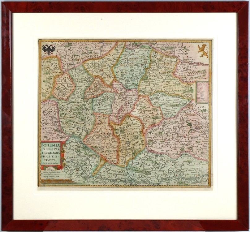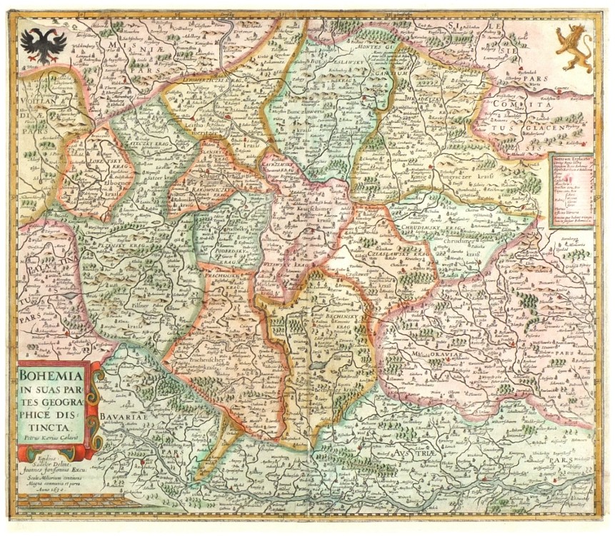 Čechy. "Bohemia in suas partes geographicé distincta". Původní kolorovaná mědirytina. Podle A. Sadelerovy předlohy ryl P. Kaerius (Pieter van den Keere). Vydal J. Janssonius v Amsterdamu, 1630. S ornamentální titulní kartuší, vysvětlivkami ("Notarum Explicatio") a českým lvem a moravskou orlicí v horních rozích mapy. 41:47 cm.