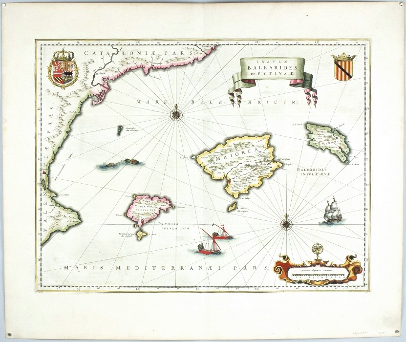 Balearic Islands. "Insulae Balearides et Pytiusae". Orig. copperplate engraving, W. J. Blaeu, Amsterdam, 1634. Orig. old colouring. With decorative title cartouche, ornamental cartouche with the scale of map, 2 coats of arms, ships end sea monsters. 38:50 cm (15 x 19 3/4 inch.). Printed on paper with wide margins sized 50,5:59 cm.