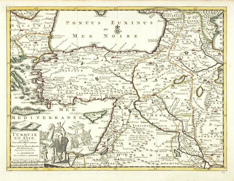 Turkey and Near East. "Turquie en Asie". Orig. copperplate engraving, Covens & Mortier, Amsterdam, ca. 1730. Orig. old colouring. With figure title cartouche. 22,5:30 cm (9 x 11 3/4 inch).