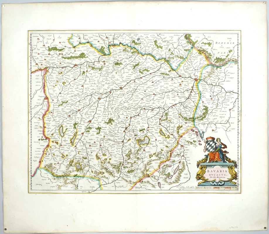 Koeman II, map 2660:2, ed. 2:201 (1640-43 Latin). - A decorative map of the Duchy of Bavaria showing the cities of Ingolstadt, Regensburg, Passau, Augsburg, Munich and others.