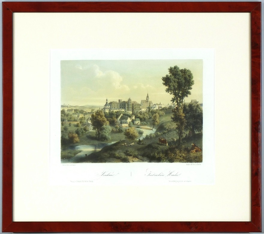 Jindřichův Hradec. "Neuhaus. Jindřichůw Hradec". Původní, staře kol. litografie s podtiskem. Podle vlastní kresby litografoval A. Haun. Sign. "Haun" v desce vpravo dole. Tiskl W. Korn v Berlíně. Vydal E. Hölzel v Olomouci, 1860. 19,5:26 cm.