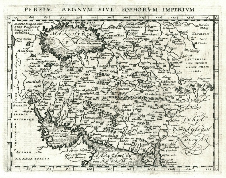 Iran. "Persiae Regnum Sive Sophorum Imperium". Orig. copperplate engraving from G. Magini's 'Geographiae Universae'. Engraved by G. Porro. Published by P. Keschedt in Cologne, 1597. With engraved title above the map. 12,5:17 cm (5 x 6 3/4 inch.) on paper sized 16:21,5 cm.