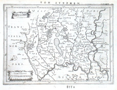 "Comitatus Zutphaniensis". Copper-engraving published in Amsterdam by J. Janssonius, 1648-51. With ornamental title-cartouche, "Milliaria Germanica" in another cartouche and engraved German title ("Von Zvtphen") above the map. 15:20,5 cm.