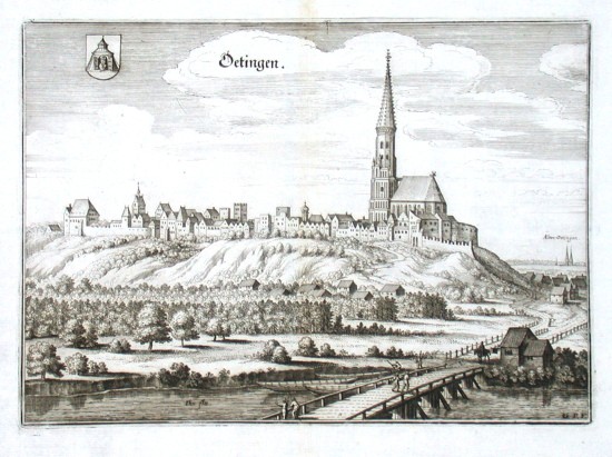 "Oetingen". Gesamtansicht der Stadt über den Inn Fluss von M. Merian, 1644. Mit Alttöting ("Alten-Oetingen") im Hintergrund und Wappen oben links. 21:39 cm.