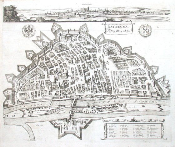 "Ratisbona. Regenspurg". Orig. Kupferstich von W. Hollar, um 1670. Mit Titelkart., 2 gr. Wappen, Erklärungen in ornament. Kart. (1-36) und gesamtansicht der Stadt oben (5,5:50,5 cm). 42:51 cm.