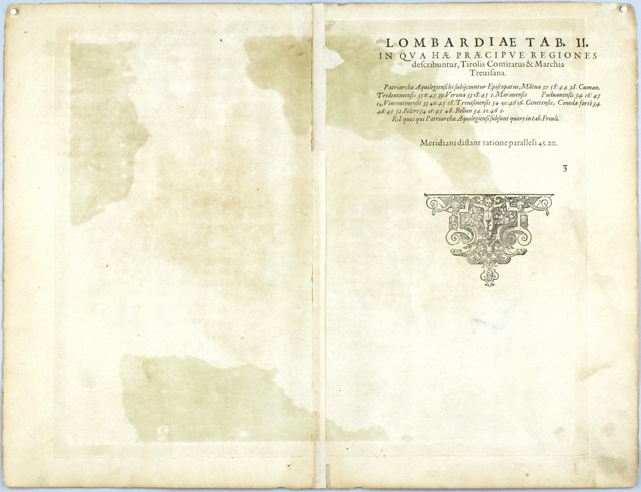 Koeman I, map 7012:1.1, ed. 1:002/11 (1585-95). - A decorative map of northeastern Lombardy, Veneto and Tyrol. With Venice on the right and Lago di Garda and the city of Trento in the centre. - From the rare 1st edition of the 1st "Atlas"!!! - A small missing part (ca. 8 x 15 mm) in the upper centrefold old repaired.