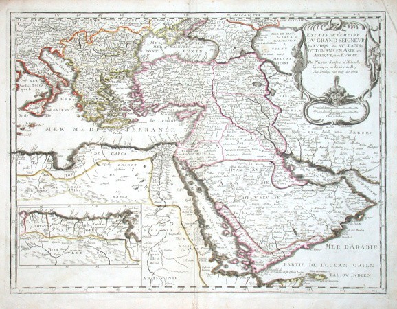 Turkey, Arabia, the Middle East. "Estats de l'Empire du Grand Seigneur des Turqs ou Sultan des Ottomans en Asie, en Afrique, et en Europe". Orig. copper-engraving by N. Sanson, published in Paris, 1654. Original outline colouring. With ornamental title-cartouche with the scale of map and inset map of the coast of North Africa (9,5:18 cm). 41:55 cm (16 1/4 x 21 3/4 inch.).