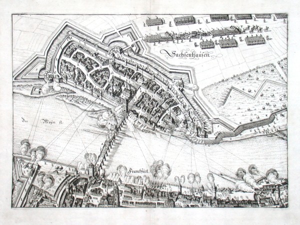 "Franckfurt. Sachsenhausen". Orig. Kupferstich von M. Merian, um 1640. Mit gest. Titel. 24,5:35 cm.