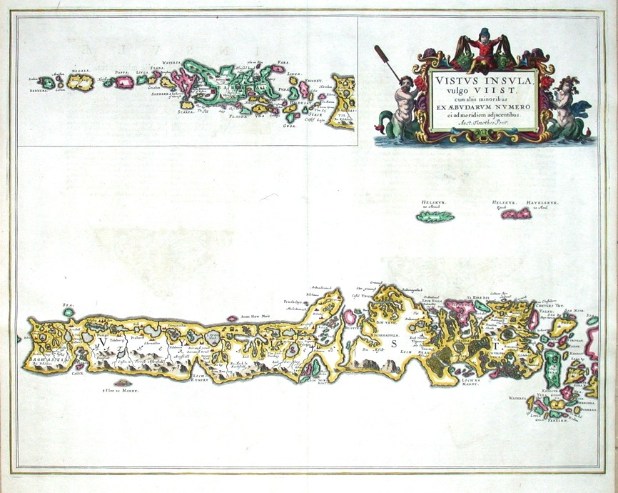 Koeman II, map 5872:2, ed. 2:401 (1654 Latin). - A map of the Isle of Uist (part of Outer Hebrides). Oriented to the West.