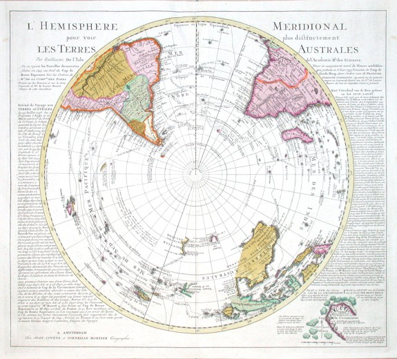 South Pole (Antarctica)."L'Hemisphere Meridional pour voir plus distinctemente les Terres Australes". Orig copper-engraving after G de l'Isle's map. Publisehd in Amsterdam by J. Covens and C. Mortier, ca. 1740. With engraved title, French-Dutch explanatory notes around the map and small inset map of the Bouvet Island ("Cap de la Circoncision" - island in the South Atlantic). 48:53 cm (19 x 21 inch.).