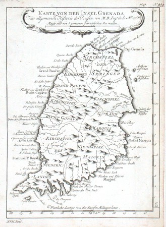"Karte von der Insel Grenada". Orig. copper-engraving, J. N. Bellin. Published in Leipzig, ca. 1760. With decorative title cartouche. 21:15,5 cm (8 1/4 x 6 1/4 inch.).