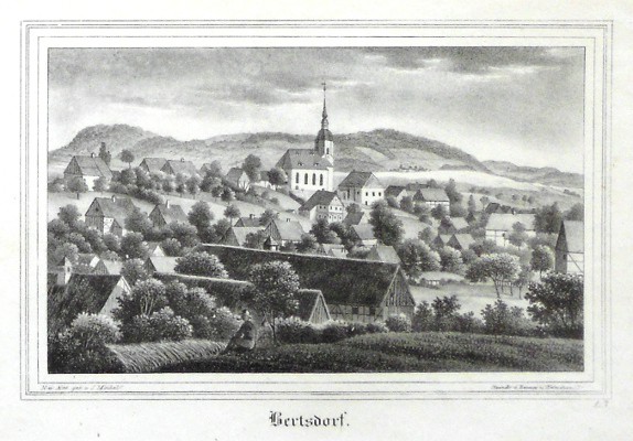 "Bertsdorf". Orig. Lithographie von Renner und Ketzschau nach Zeichnung von Julius Möckel. Mit eine Figure forne. Aus Sachsens Kirchen-Galerie. Dresden, H. Schmidt, 1837. 14:21,5 cm.