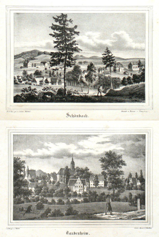 "Schönbach". Orig. Lithographie von Renner und Ketzschau nach Zeichnung von Julius Möckel. Mit eine Figure forne. Aus Sachsens Kirchen-Galerie. Dresden, H. Schmidt, 1837. 15,5:21,5 cm.