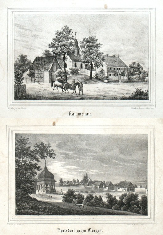 "Rammenau". Orig. Lithographie von Renner und Ketzschau nach Zeichnung von Julius Möckel. Mit Figuren und Pferde forne. Aus Sachsens Kirchen-Galerie. Dresden, H. Schmidt, 1837. 14:21 cm.