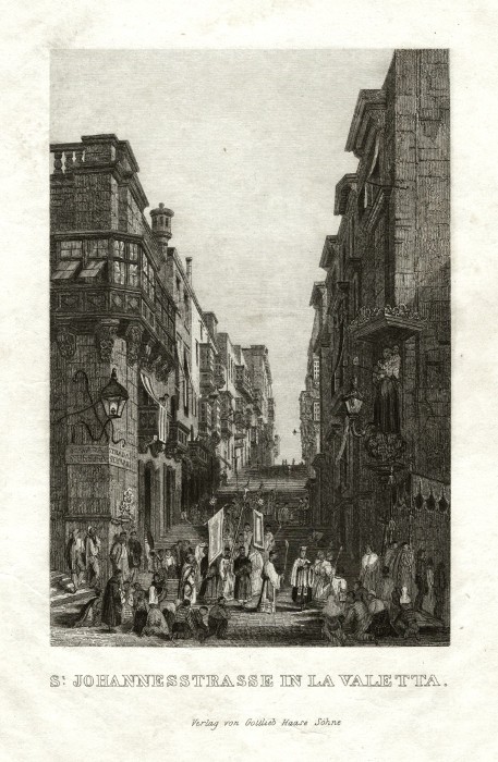 Valletta. "St. Johannesstrasse in La Valetta". Orig. steel engraving. Published by G. Haase Söhne, Prague, ca. 1840. With a procession in the foreground and a German title under the picture. 14,5:10 cm (5 3/4 x 4 inch.; the picture).