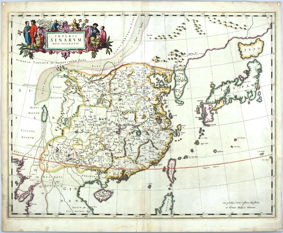 China, Korea and Japan. "Imperii Sinarum Nova Descriptio". Orig. copperplate engraving after M. Martini's map of China. Published by J. Blaeu in Amsterdam, 1655. Orig. old colouring. With great figure title cartouche. 46:60 cm (18 1/4 x 23 3/4 inch.) on paper sized 51:62,5 cm.