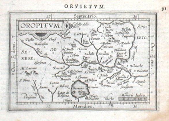 Orvieto. "Oropitum". Orig. copper-engraving from the Latin edition of A. Ortelius' Epitome. Published by J. B. Vrients in Antwerp, 1609. With ornamental title-cartouche, the scale of map ("Milliaria Italica") and Latin title above the map ("Orvietvm"). 8,5:12,5 cm (3 1/2 x 5 inch.).