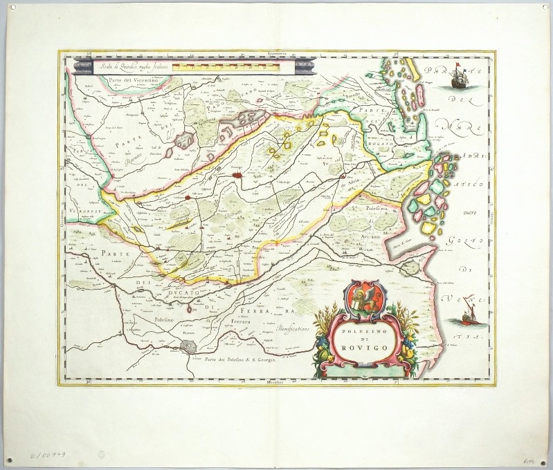 Rovigo. "Polesino di Rovigo". Orig. copperplate engraving. Published by J. and W. Blaeu in Amsterdam, 1640. Orig. old colouring. With ornamental title cartouche with a coat of arms, another ornamental cartouche with the scale of map ("Scala di Quindici miglia Italiane") and 2 sailing ships. 38,5:50,5 cm (15 1/4 x 19 3/4 inch.) on paper sized 52,5:62,5 cm.