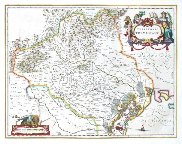 Treviso. "Territorio Trevigiano". Orig. copper-engraving. Published by J. and W. Blaeu in Amsterdam, 1640. Orig. old colouring. With figure title-cartouche, a cartouche with the scale of map ("Scala di miglia cinque Italiane") with a lion, and a sailing ship. 38:50 cm (15 x 19 3/4 inch.).