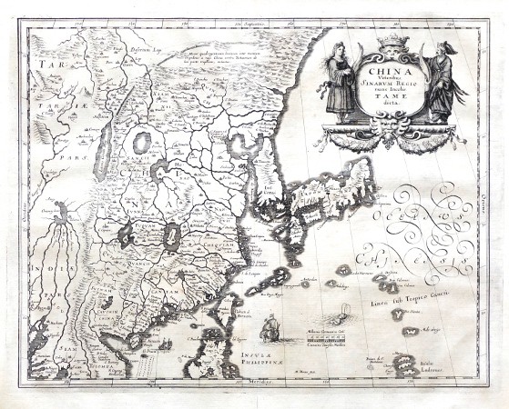 China."China Veteribus Sinarum Regio nunc Incolis Tame dicta". Orig. copper-engraving, M. Merian, Frankfur am Main, 1638. With great figure title-cartouche, the scale of map, 2 ships and a sea-creature. 27:34,5 cm (10 3/4 x 13 3/4 inch.).