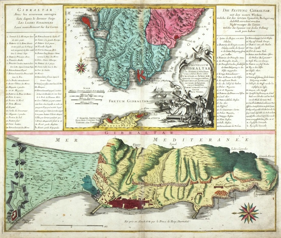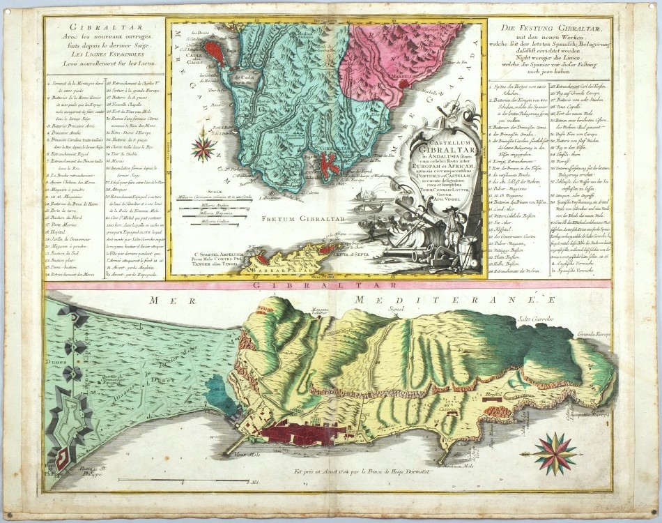 Gibraltar. "Castellum Gibraltar in Andalusia ...". Orig. copperplate engraving, T. C. Lotter (1717-1777), Augsburg, ca. 1750. Orig. old colouring. With figure title-cartouche, 2 wind-roses and Fr.-Ger. explanatory notes. 49:58,5 cm (19 1/4 x 23 inch.).