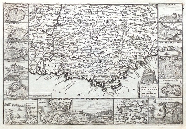 "Carte de Provence". Orig. copper-engraving. Published by D. de la Feuille in Amsterdam, 1706. With ornamental title-cartouche with a coat-of-arms and a cartouche with the scale of map. The map is surrounded by 11 fortifications plans of main Provence cities, 3 miniature maps and a view of Marseille. 17:25 cm (6 3/4 x 10 inch.).