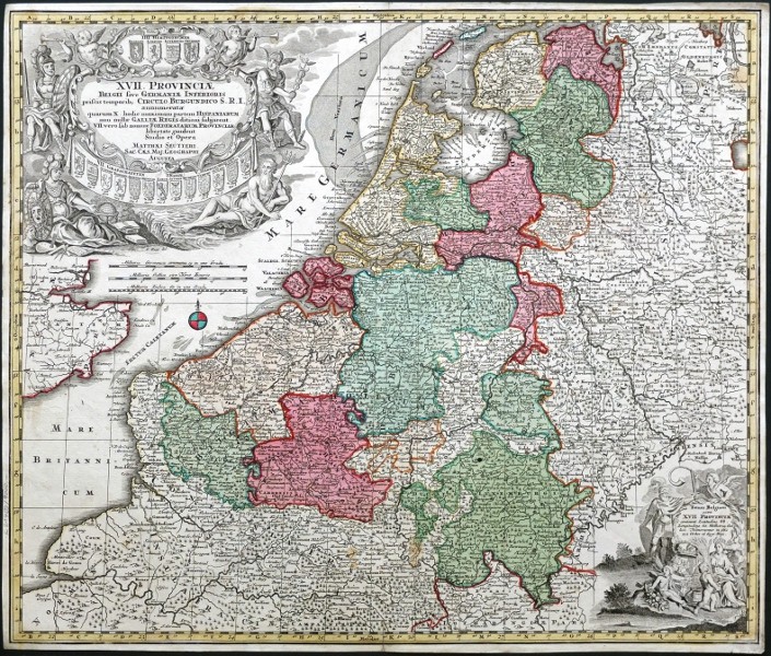 Netherlands, Belgium and Luxembourg. "XVII. Provinciae Belgii sive Germaniae inferioris". Orig. copper-engraving, M. Seutter, ca. 1730. With great title cartouche with many coats-of-arms and another figure cartouche. 49,5:58,5 cm.