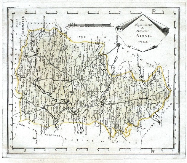 Includes maps nrs. 801-826 + map of Paris. The departments, provinces and regions included are: environs of Paris ("Die Gegend um Paris"), Manche ("Das Département des Canals la Manche"), Calvados ("Das Département der Klippen von Calvados"), Orne ("Das Départementdes Flusses Orne"), Eure ("Das Département des Flusses Eure"), Seine Maritime ("Das Département des untern Seine Flusses"), Pas de Calais ("Das Département der Meerenge von Calais"), Somme ("Das Département des Flusses Somme"), Aisne ("Das Département des Flusses Aisne"), Nord ("Das Département vom Nord"), West Flandres ("Das Département des Flusses Lys"), department Forêts in present-day Belgian Wallonia region with a large portion of Luxembourg ("Das Département der Wälder Forêts"), Ourthe with the city of Liège in the centre ("Das Département des Flusses Ourthe"), Dyle with the City of Brussels left of the centre ("Das Département des Flusses Dyle"), Antwerp Province ("Das Département der beyden Flüsse Nethe"), East Flanders ("Das Département des Flusses Schelde"), Hainaut Province ("Das Département des Berges Iemmappe"), Namur ("Das Département der Flüsse Sambre und Maas"), Dutch province Limburg with the city of Mastricht on the South ("Das Département des untern Maas Flusses"), Lower Rhine region in Germany ("Das Département des Flusses Roer"), region of the Sarre river - France/Germany ("Das Département des Flusses Sarre"), Koblenz region in Rhineland-Palatine, Germany ("Das Département der Flüsse Rhein und Mosel"), Rhine-Neckar Metropolitan Region, Germany ("Das Département vom Donnersberge"), Haute-Savoie ("Das Département des Sees Leman"), Savoye ("Das Département von Mont Blanc"), Alpes Maritimes ("Das Département der Meer Alpen"), Vaucluse with the city of Avignon on the left ("Das Département des Ortes Vaucluse").