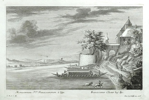 Ybbs an der Donau. "Monasterium P. P. Franciscanorum a Yps. - Franciscaner Closter beij Yps". Orig. Kupferstich aus "Theatrum Danubii - Schauplatz des Donau-Stroms", Augsburg bei Jer. Wolff Erben, um 1730. Mit Figuren auf den Boote vorne und lat.-dt. Titel unten. 18:29 cm.