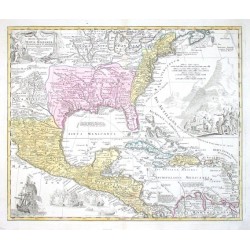 North America, Louisiana, Florida, Mexico and the Caribbean. "Regni Mexicani seu Novae Hispaniae, Floridae, Novae Angliae, Carolinae, Virginiae, et Pennsylvaniae ...". Orig. copperplate engraving, published by J. B. Homann, ca. 1720. 48:58 cm.