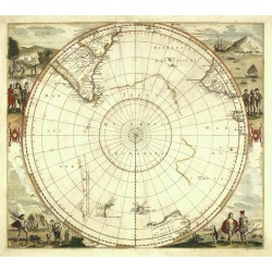 South Pole (Antarctica).("Polus Antarcticus"). Orig. copper-engraving after H. Hondius' map of the region. Published in Amsterdam by P. Schenk and G. Valk, ca. 1690. Orig. old colouring. With decorative scenes (ships, aborigins, penguins ...)...