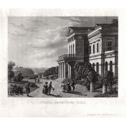 Praha. Letohrádek Kinských. "Fürstl. Kynsky'sche Villa". Původní ocelorytina, V. Merklas. Vyd. Borrosch a André v Praze, 1852. S půvabnou figurální satafážií v popředí a německým titulem pod obrázkem. 7,3:9,9 cm na papíře o rozměrech 10,9:14,3 cm.