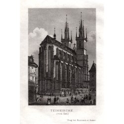 Praha. Kostel Panny Marie před Týnem (Týnský chrám). "Teinkirche (von Ost)". Původní ocelorytina, V. Merklas. Vyd. Borrosch a André v Praze, 1852. S půvabnou figurální satafážií v popředí a německým titulem pod obrázkem. 9,8:6,9 cm na papíře o rozměrech 14,8:10,5 cm.