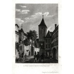 Praha. Pražský Hrad - Staré purkrabství, Daliborka. "Altes Oberstburggrafenamt". Původní ocelorytina. Vyd. Borrosch a André v Praze, 1852. S půvabnou figurální satafážií v popředí a německým titulem pod obrázkem. 10:7,1 cm na papíře o rozměrech 14,8:10,7 cm.