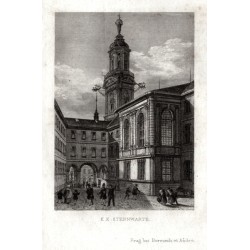Praha. Klementinum - Astronomická věž. "K. K. Sternwarte". Původní ocelorytina, V. Merklas. Vyd. Borrosch a André v Praze, 1852. S půvabnou figurální stafáží v popředí a německým titulem pod obrázkem. 10:7 cm.