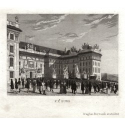 Praha. Pražský hrad - Česká dvorská kancelář. "Die alte Ständische Landtags-Kanzley auf dem Hradschin". Původní ocelorytina, V. Merklas. Vyd. Borrosch a André v Praze, 1852. S půvabnou figurální stafáží v popředí a německým titulem pod obrázkem. 10:7,3 cm.