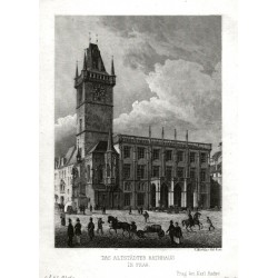 Old Town Hall."Das Altstädter Rathhaus". Pův. oceloryt. Podle vlastní kresby ryl V. Merklas (1809-1867), vydal K. André v Praze, ca. 1830. S mnoha figurami v popředí. 11,5:8,5 cm.