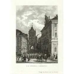 Praha. Prašná brána z Celetné ulice. "K. K. General-Commando". Původní ocelorytina, V. Merklas. Vyd. Borrosch a André v Praze, 1852. S půvabnou figurální satafážií v popředí a německým titulem pod obrázkem. 9,8:7,2 cm.