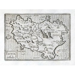 "Ischia insula". Orig. copper-engraving. Published by C. J. Visscher in Amsterdam, 1649 (in Tabulae Geographicae Contrare). With ornamental title-cartouche and the scale of map ("Miliare Italicum"). 9:12,5 cm (3 1/2 x 5 inch.).