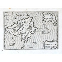 Maiorca and Menorca."Majorcae et Minorcae descrip.". Orig. copper-engraving. Published by C. J. Visscher in Amsterdam, 1649 (in Tabulae Geographicae Contrare). With ornamental title-cartouche, another cartouche with the scale of map ("Mill....