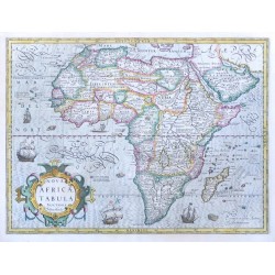 Africa."Nova Africae Tabula. Auctore Jodoco Hondio". Orig. copper-engraving, J. Hondius (1563-1612), Amsterdam, first published 1606. With great ornamental title-cartouche, 5 sailing ships and 3 sea monsters. 37,5:50 cm (14 3/4 x 19 3/4 inch.).