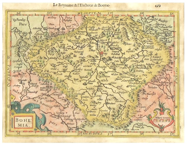 Čechy. "Bohemia". Pův., staře kolorovaný mědiryt z Mercatorova Atlasu Minor. Vyd. J. Hondius, C. Claesz. a J. Jansz. v Amsterdamu, 1607. S ornamet. titulní kartuší, další ornamentální kartuší s měřítkem mapy ("Miliaria Germanic") a francouzským titulem ("Le Royaume & Electorat de Boeme") nad mapou. 14:19,5 cm.