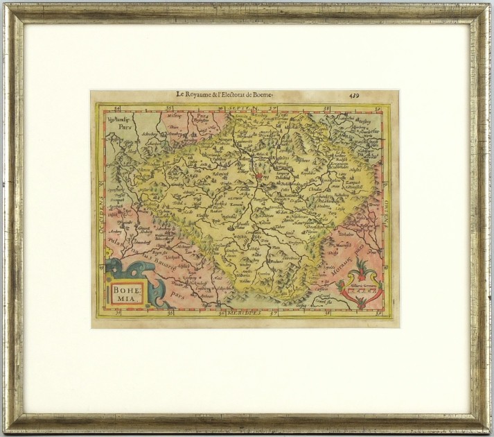 Koeman III, map 2850:351, ed. 351:01 (1607 Atlas Minor). - Dekorativní mapka Čech. - Cena s kořenicovým rámem (35:37,5 cm).