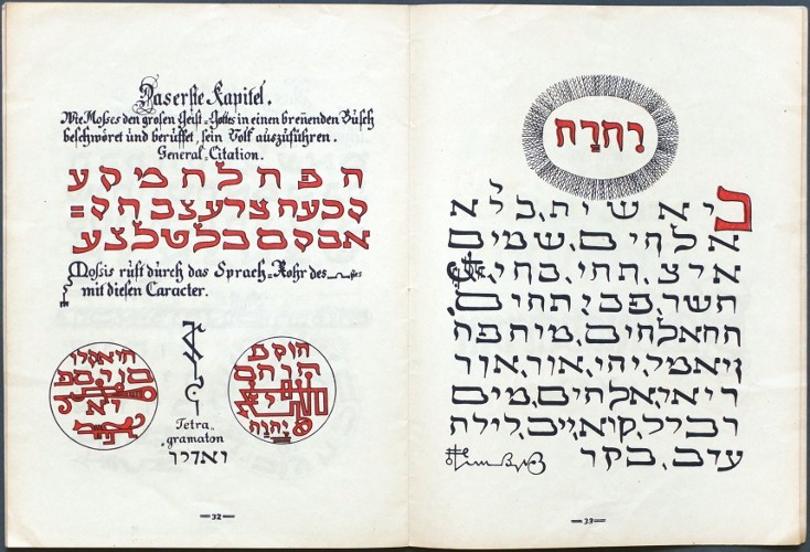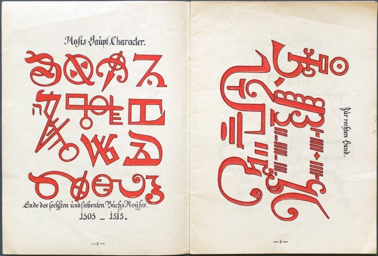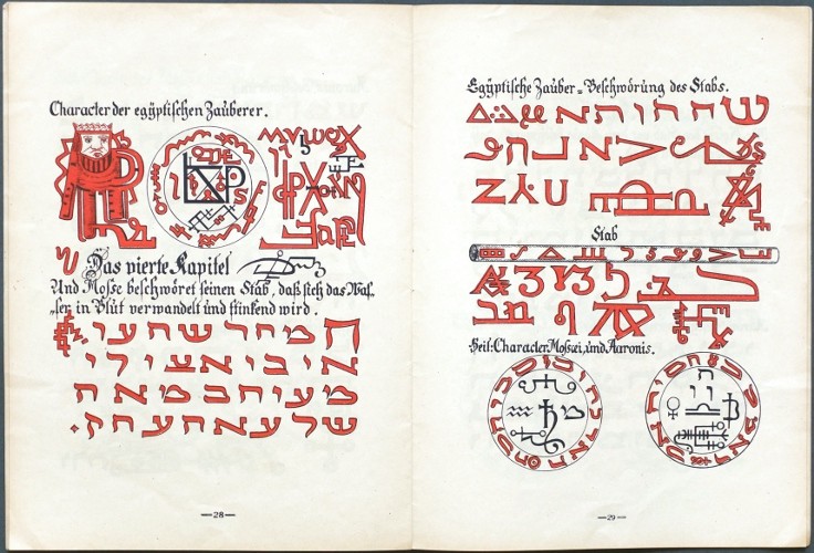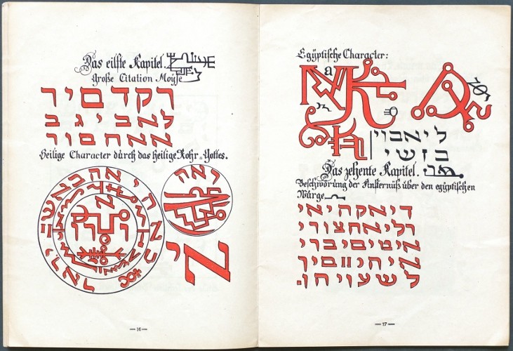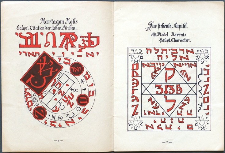 (Megmet, A.). "Das VI und VII Buch Moÿses". Roudnice nad Labem: Vitrografie, ca. 1900. 4°. 44 str. Černě a červeně litografovaný text, Lipš, Roudnice. OIllBrož.