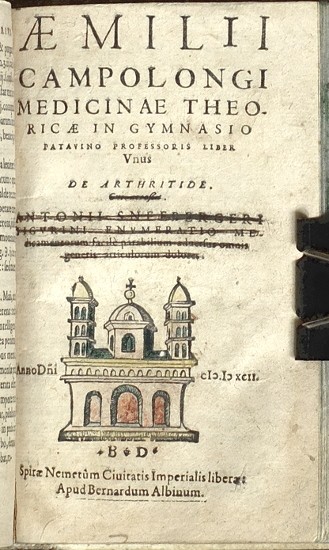 Medicína. Scribonius, Wilhelm Adolf (1550-1600). ("Idea Medicinae secundum logicas leges informandae et describendae. Cui accesit de inspectione urinarum; Item de hydrope; De podagra et dysentria, physiologa curiosa"). Basel: Waldkirch, 1585. (19), 93 (recte 95), (5) pp. Woodcut publishing mark on the last page. Bound with: Platter, Felix (1536-1614). "Archiatri de Febribus Liber: Genera, causas, & curationes febrium tribus Capitibus proponens. Præfixis Tabulis tribus: ordinem & methodum singulorum capitum demonstrantibus". Frankfurt n. Mohanem: A. Wechel - heirs, 1597. (8), 354 pp. Woodcut publishing mark on the title. Bound with: Campolongo, Emilio (1550-1604). "Aemilii Campolongi ... Liber unus De arthritide ...". Speyer: B. Albini. 1592. (13), 111 str. Woodcut publishing mark on the title. Second title (Antonii Sneebergeri Tigurini enumeratio medicamentorum facile parabilium aduersus omnis genetis articulorum dolores) was not bound. Renaissance blind embossed leather binding with well-preserved buckles. Three medical writings from the 16th century in one volume. - In many places the text is underlined with a pen. Old handwritten notes on margins. - The title page of the first book (Scribonius) is missing. On the title of the third book (Campolongo), the name of the unbound second title was crossed out with a pen.