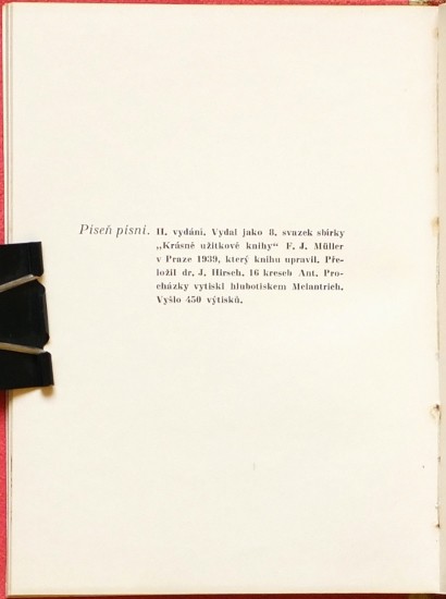 "Píseň písní". Praha: F. J. Müller, 1939. Přeložil J. Hirsch. 8. svazek Krásné užitkové literatury. 2. vydání. 12°. (48) str. s 16 hlubotiskem tištěnými kresbami Antonína Procházky. Dobová polopl. vazba se zlac. titulem na hřbetu.
