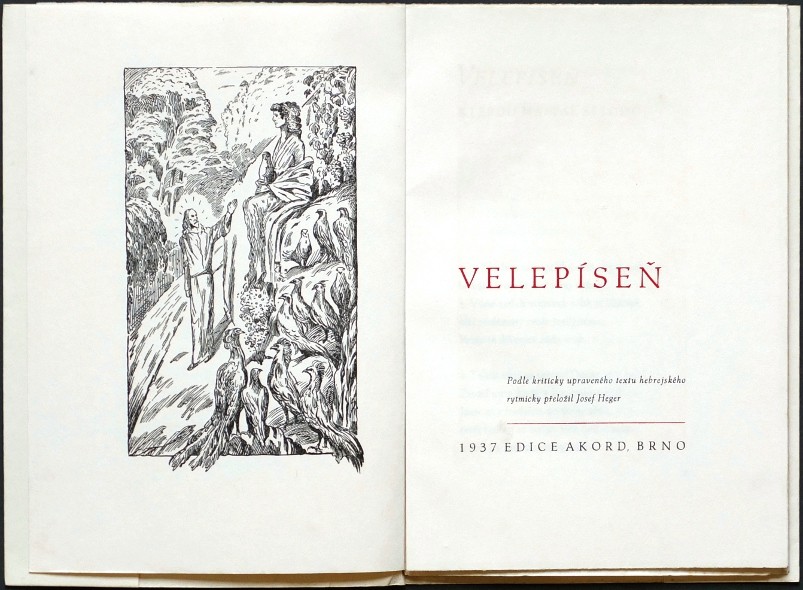 Heger, Josef (přel.; 1885-1952). "Velepíseň". Podle kriticky upraveného hebrejského textu rytmicky přeložil J. Heger. Brno: Ed. Akord, 12. sv., 1937. 8°. 47, (4) str.. Kresbami vyzdobil Jan Konůpek. Ex. XXIII/500 na holandu Pannekoek. OBrož.