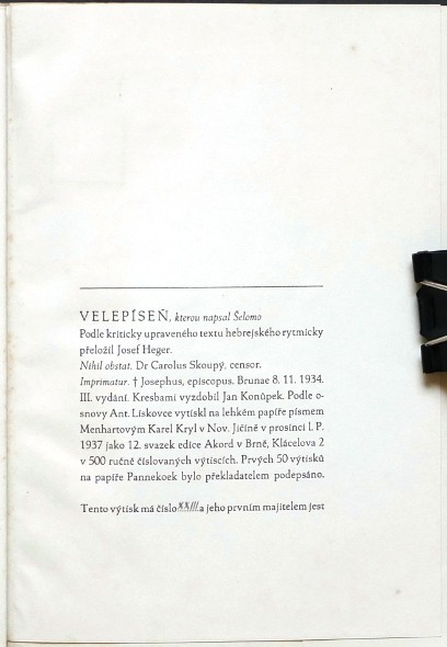 Heger, Josef (přel.; 1885-1952). "Velepíseň, kterou napsal Šelomo". Podle kriticky upraveného hebrejského textu rytmicky přeložil J. Heger. Brno: Ed. Akord, 12. sv., 1937. 8°. 47, (4) str.. Kresbami vyzdobil Jan Konůpek. Ex. XXIII/500 na holandu Pannekoek. OBrož.