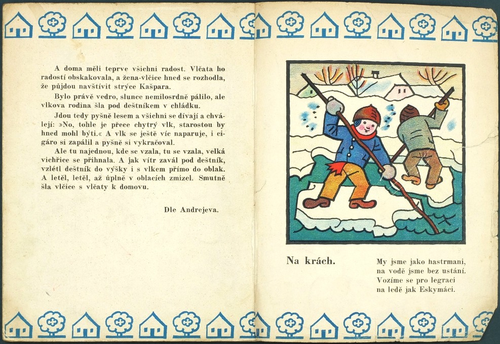 J. A. Novotný: Ladova ilustrace, Praha, 1957 - str. 42. - Drobná trhlinka (ca. 1 cm) v okrajích listů 1, 8, 13 (tj. str. 1-2, 15-16, 25-26) a na přední i zadní straně obálky (viz foto), drobná skvrna na listech 15 a 16 (str. 30-31). Hřbet zpevněn (vhodným) přelepením. - Na používanou dětskou knihu dobře zachováno, obrázky velmi dobře.